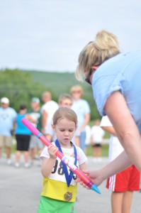 The Kid’s Mile kicked off the event.  Participants raced around the Midway baseball field while parents and bystanders cheered them on.  Miss Emma Snow won the gold medal, Nathan Byers the Silver and Jake Sullivan the Bronze.